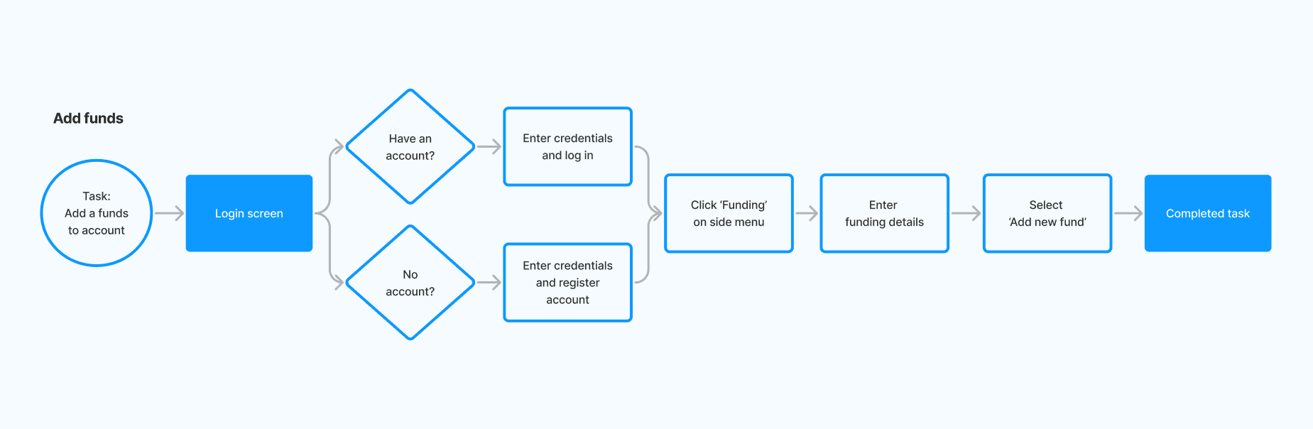 Once the core problems were clear, I mapped two critical workflows (funding an account and adding a new user) then built low-fi wireframes to test whether the overall structure held up before investing in visuals.