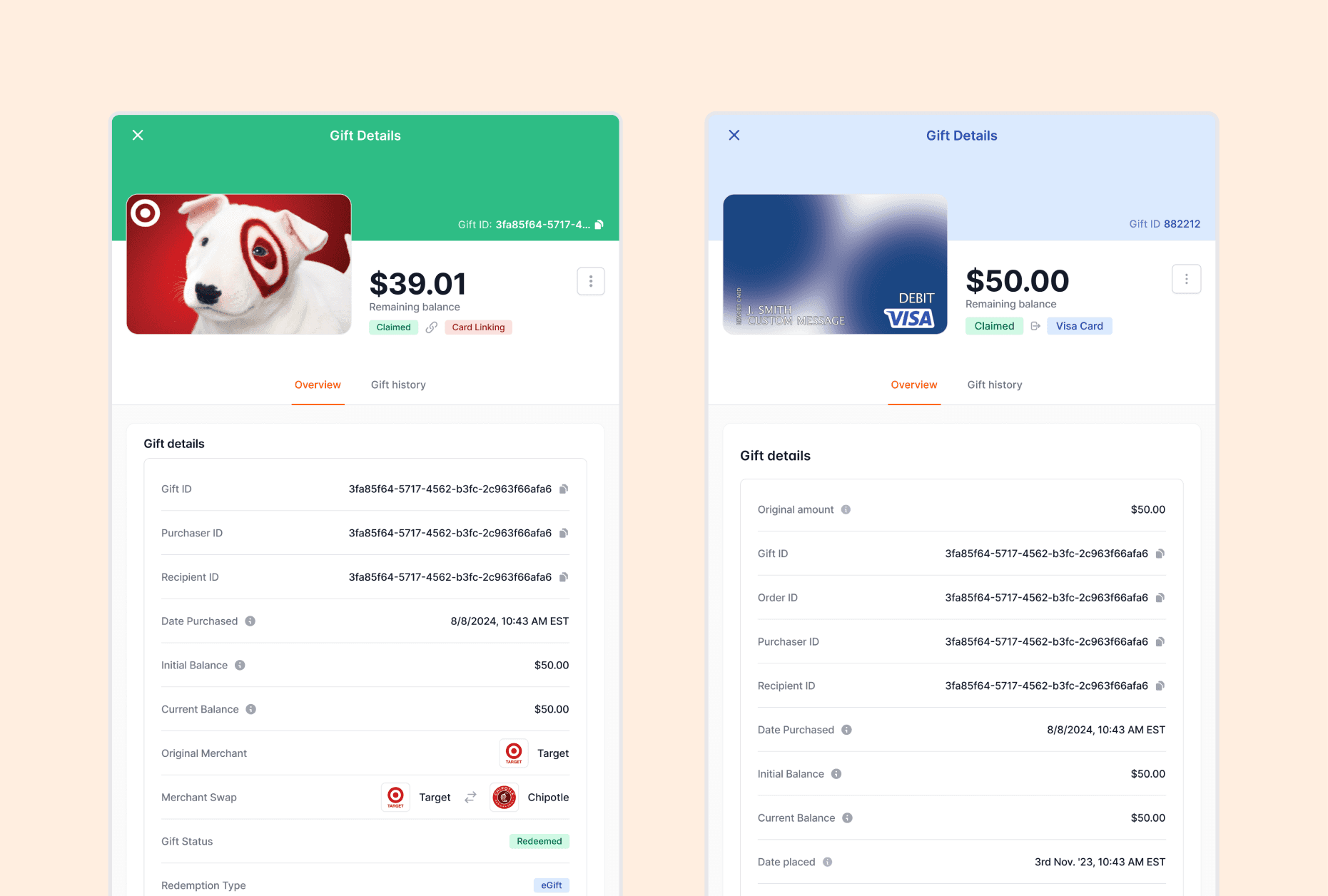 Gift detail view gives admins complete transaction visibility without contacting support.